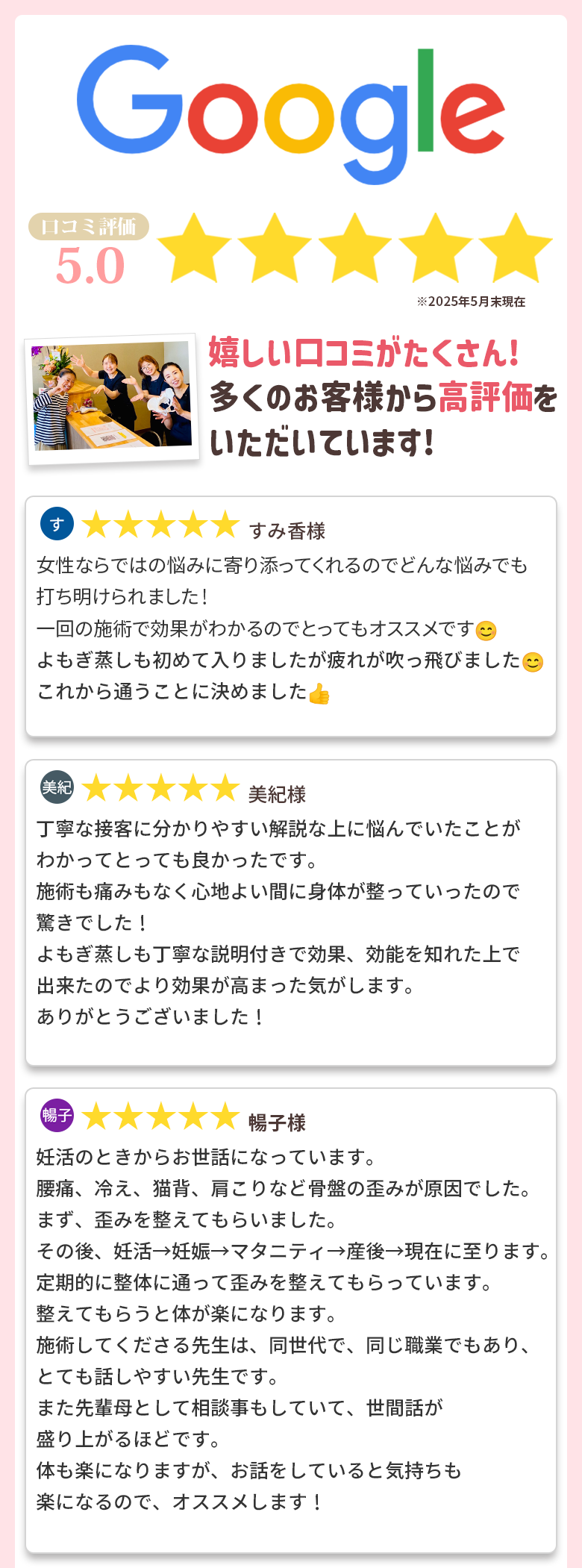 施術者も来店者も女性のみのサロンだから、デリケートなお悩みや体の変化も気兼ねなく相談できます。男性の目を気にせず、心からリラックスして過ごせる空間は、多くの女性から「通いやすい」と支持されています。