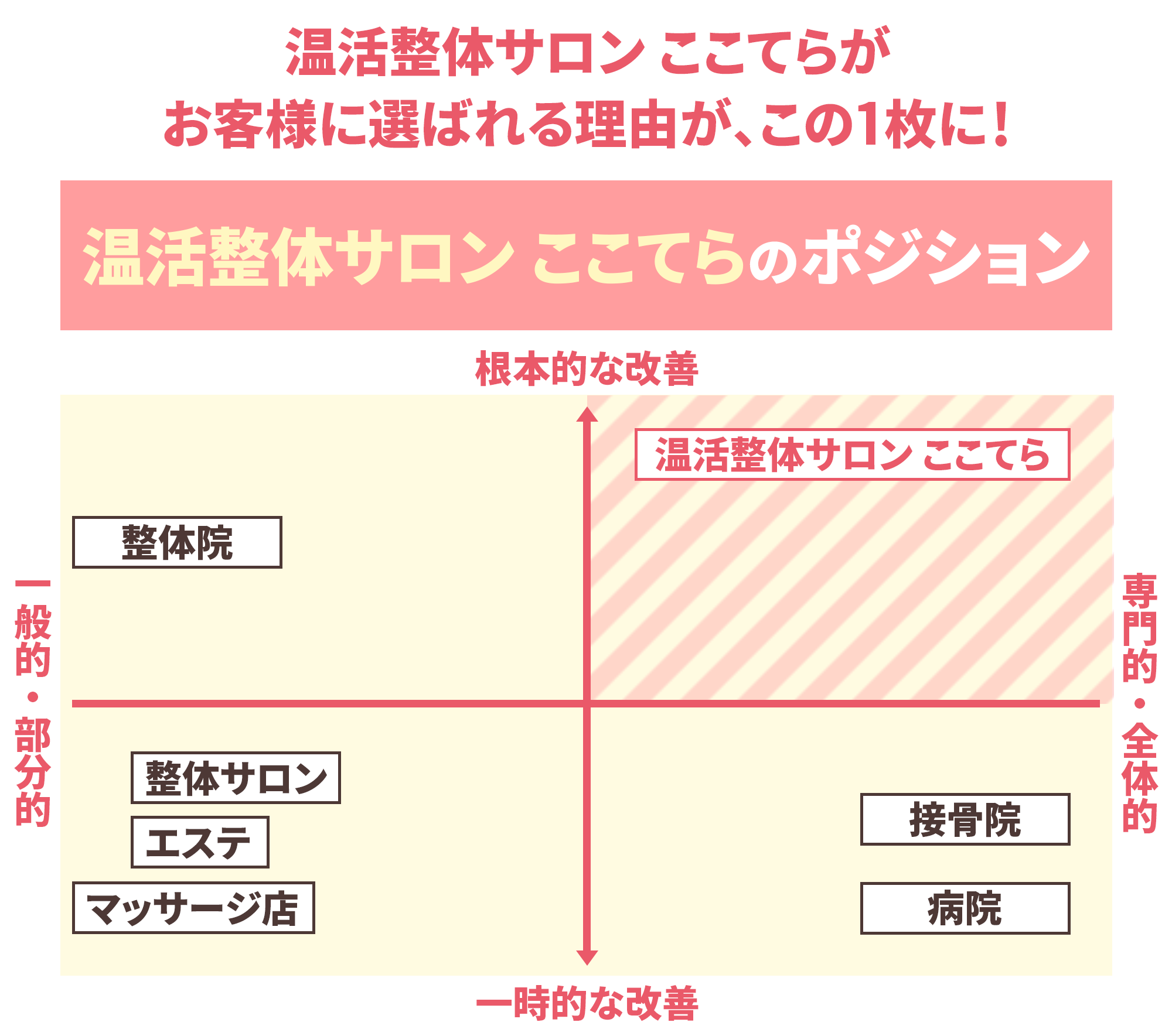 「ここてら」では、看護師としての知識と経験を活かし、女性と子供の体を熟知したスタッフが、女性特有の歪みによる不調にアプローチします。