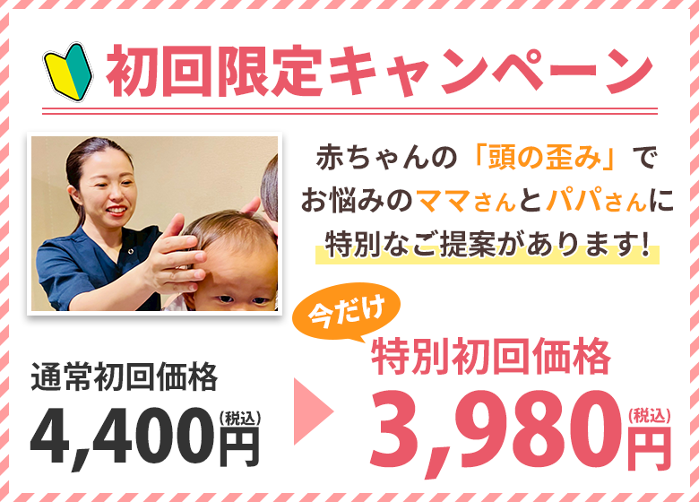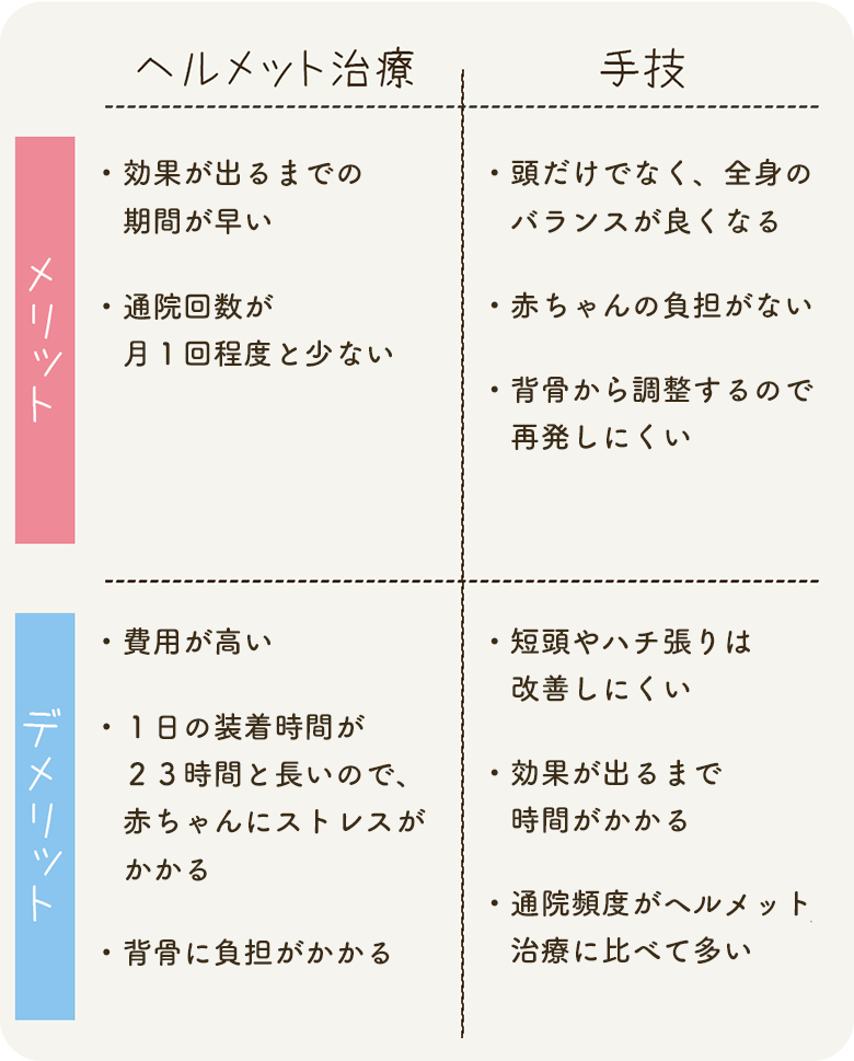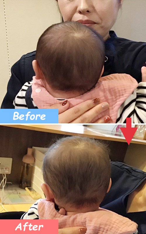 - ヘルメット治療では6ヶ月に及ぶ着用が必要ですが、赤ちゃんの整体では1週間に1回程度で、早い赤ちゃんですと3ヶ月目から効果を感じていただけます。
