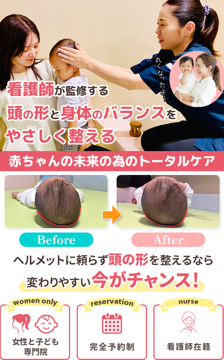 赤ちゃんの頭の形が気になり、子供が将来外見が困らないようにと思って来院しました。 頭の形はもちろん、骨盤周りなどもしっかり見て頂きケアをしてもらいました😊 1回の施術で頭の形が変わって驚きました。また自宅でのケアも教えて頂き難しくもないので気軽にできそうです✨️ 看護師さんが運営しているのもあり安心してお任せできます😌 どんどん赤ちゃんの頭の形がキレイになっていくのが楽しみです👶🩷