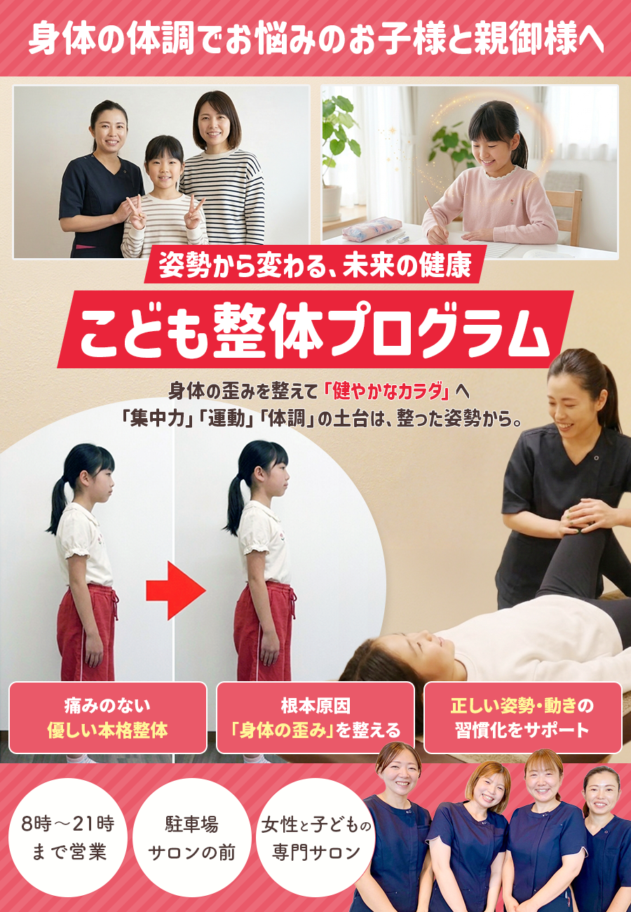 成長期のお子様の身体は非常に柔軟ですが、その分、周囲の影響を受けやすい繊細な時期でもあるため、悪い癖が定着しやすく、身体の歪みも波及しやすいです。