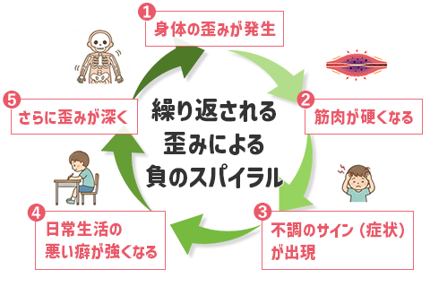 身体は一部でも歪みが生じてしまうと『負のスパイラル』を形成し、全身へと波及していってしまいます。