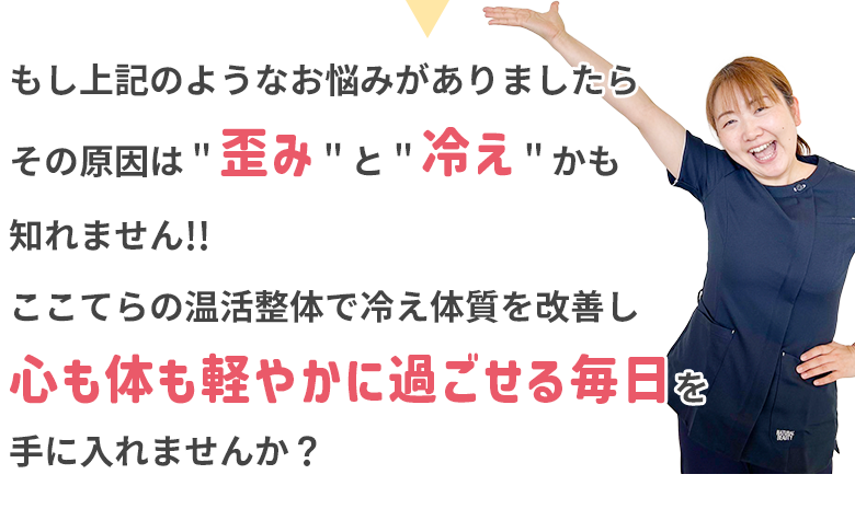 実は、体の「歪み」や「冷え」もプレ更年期の不調を悪化させる大きな要因の一つなのです。