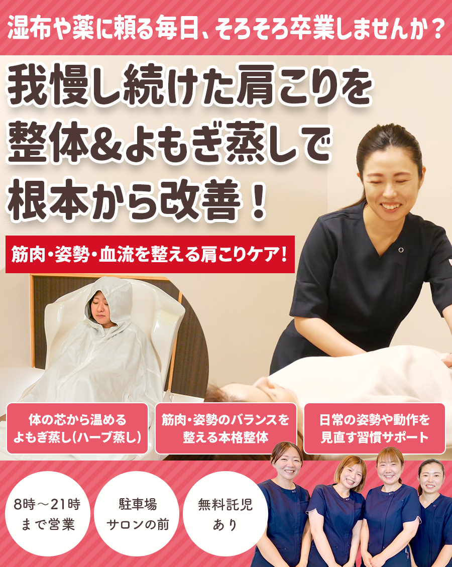 温活整体を受けることで、体のバランスを整え、体の内側から代謝が上がり、自然治癒力が高まるため、つらい肩こりを根本から改善へと導きます。